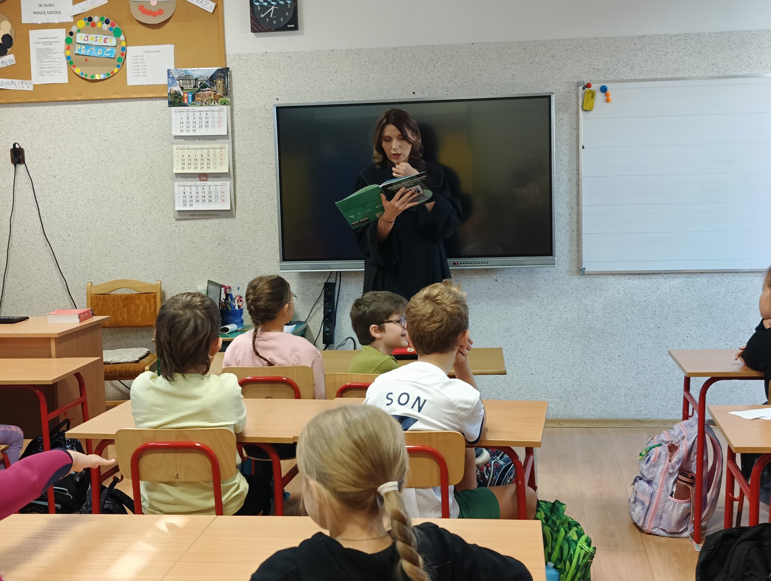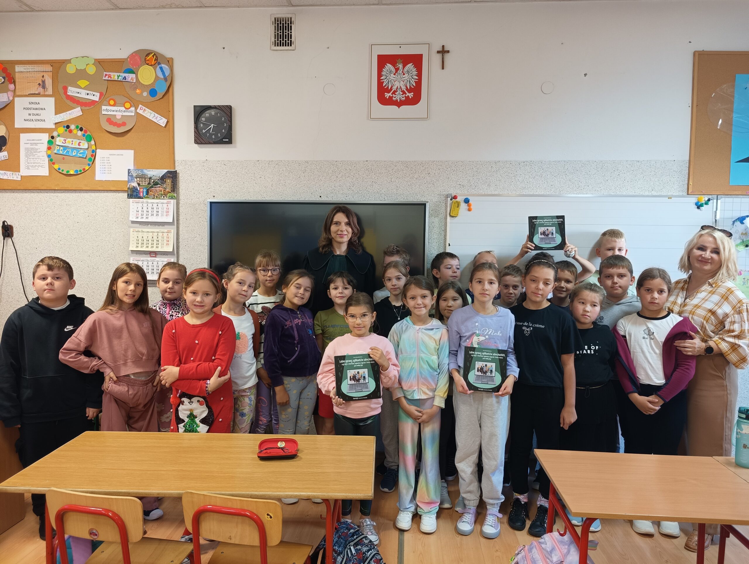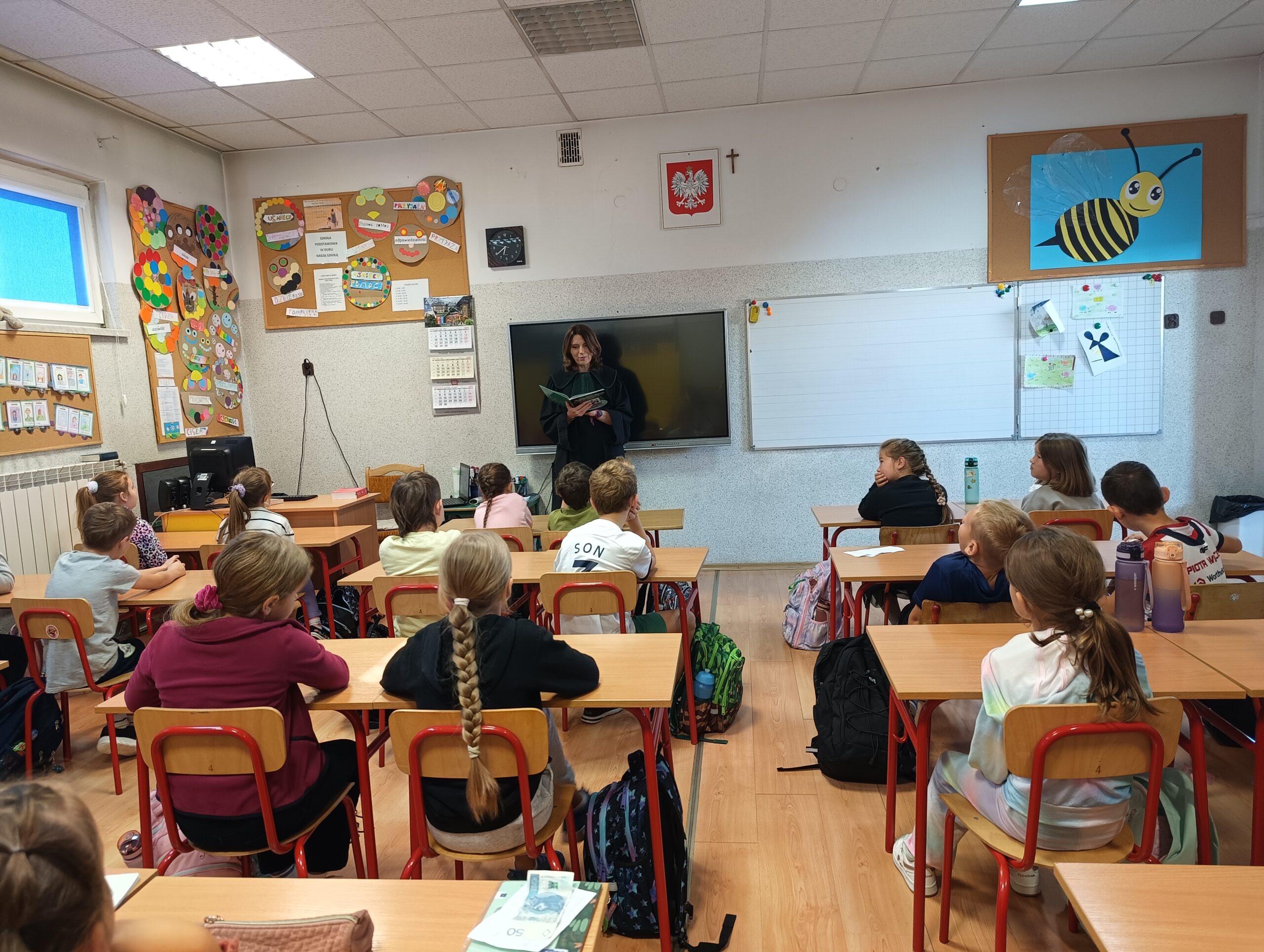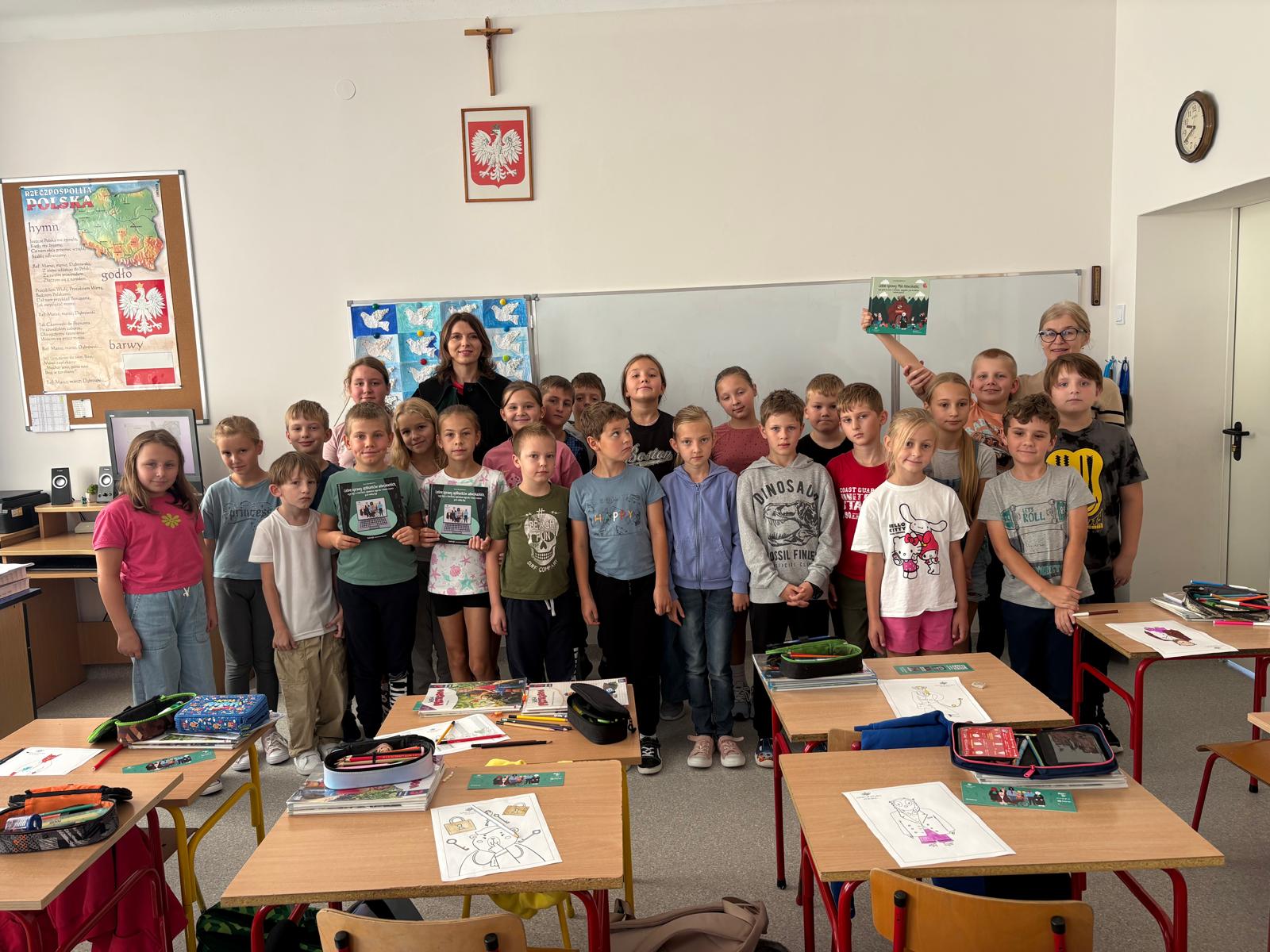 W dniach 18 i 19 września kolejny raz w naszej szkole przeprowadzona została dla chętnych klas ogólnopolska akcja „Bajeczni adwokaci”. Przeprowadziła ją pani mecenas Renata Dragan-Zięba, która poprzez czytanie bajki „Leśne sprawy aplikantów adwokackich , czyli hejt w internecie, tajemnicza nagroda i krecia robota pod wielką lipą” i pogadankę tematyczną wprowadziła uczniów w bardzo ważne tematy. Uczniowie dowiedzieli się, że niezależnie od tego, czy ktoś ma lat pięć czy pięćdziesiąt pięć, w Internecie może czyhać na niego wiele niebezpieczeństw i pułapek. Nauczyli się również, że słowo „hejt” ma bardzo negatywny oddźwięk i jest czymś bardzo złym. Szczególnie wartościowe było umiejętne połączenie przez panią mecenas języka dziecięcego z tematyką prawną i społeczną. Uczniowie nie tylko zdobyli cenną wiedzę o swoich prawach, ale również budowali w sobie postawę szacunku do innych, uważności na słowa i świadomego funkcjonowania w cyfrowym świecie. Dzieci otrzymały od pani adwokat pamiątkowe zakładki, malowanki i książki. Bardzo dziękujemy i wierzymy, że akcja ta w znacznym stopniu przyczyni się do podniesienia bezpieczeństwa cyfrowego i kształtowania właściwych relacji interpersonalnych.