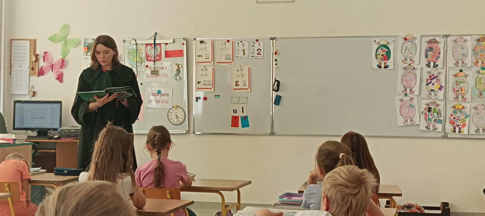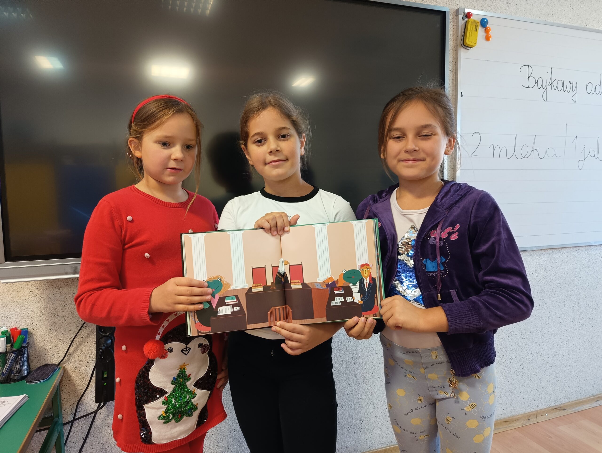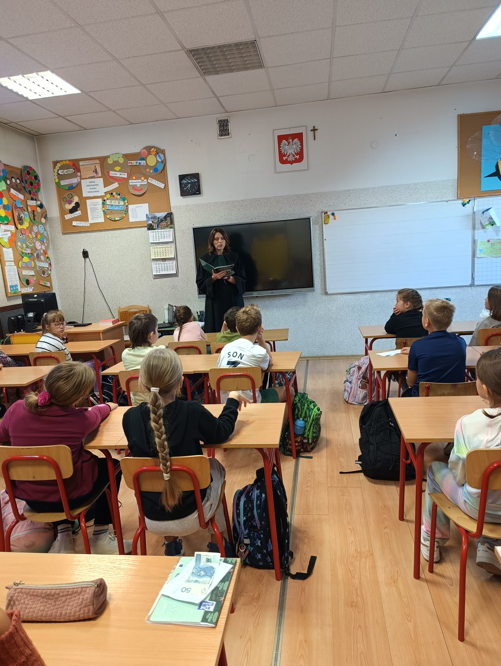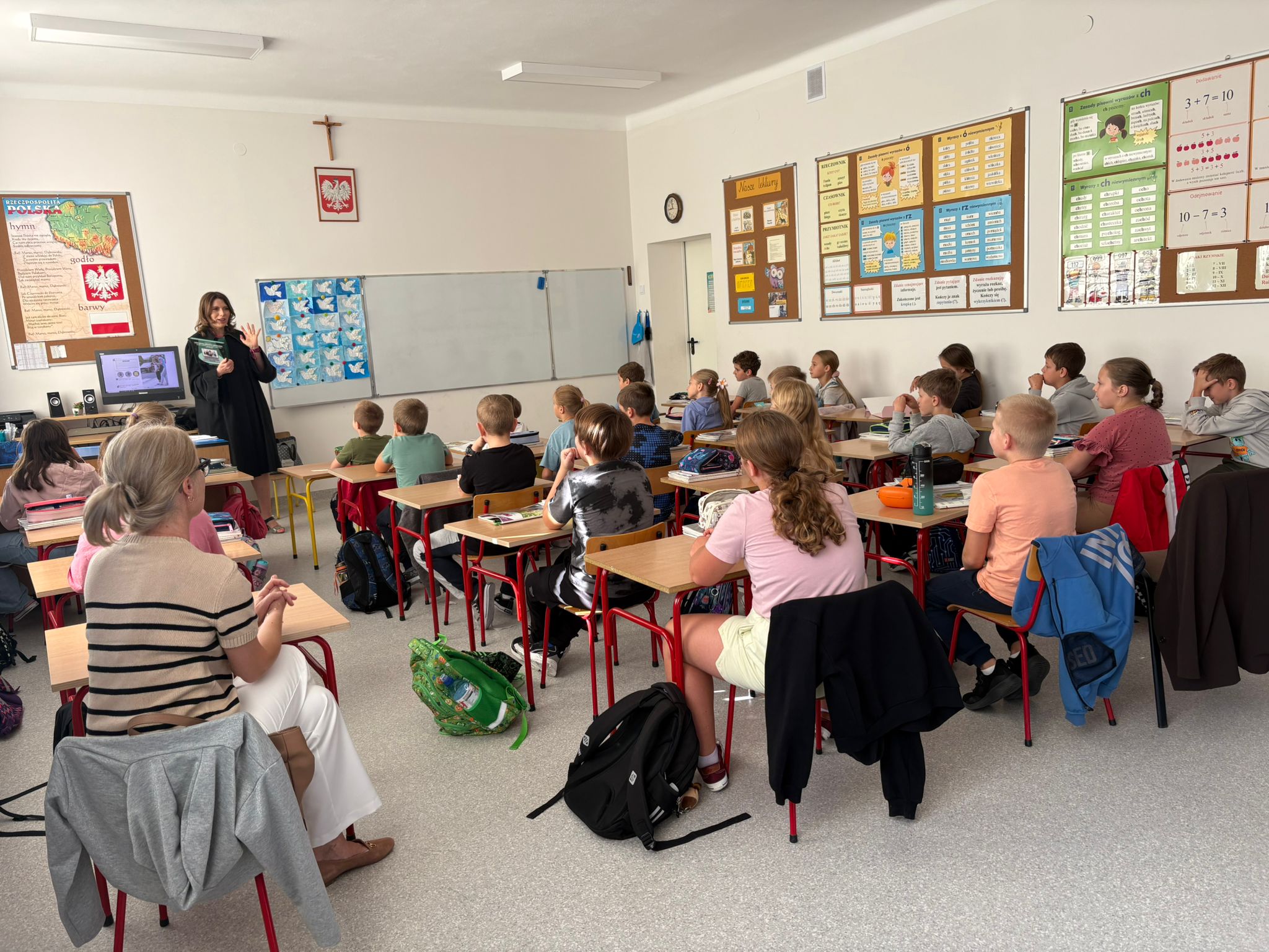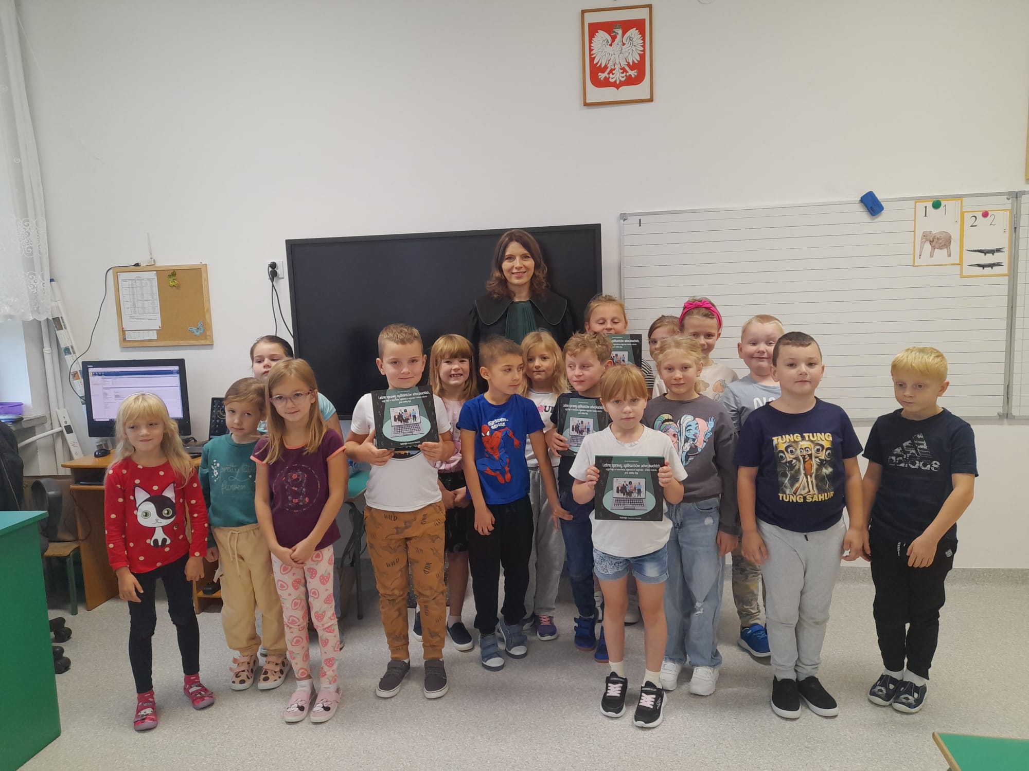 W dniach 18 i 19 września kolejny raz w naszej szkole przeprowadzona została dla chętnych klas ogólnopolska akcja „Bajeczni adwokaci”. Przeprowadziła ją pani mecenas Renata Dragan-Zięba, która poprzez czytanie bajki „Leśne sprawy aplikantów adwokackich , czyli hejt w internecie, tajemnicza nagroda i krecia robota pod wielką lipą” i pogadankę tematyczną wprowadziła uczniów w bardzo ważne tematy. Uczniowie dowiedzieli się, że niezależnie od tego, czy ktoś ma lat pięć czy pięćdziesiąt pięć, w Internecie może czyhać na niego wiele niebezpieczeństw i pułapek. Nauczyli się również, że słowo „hejt” ma bardzo negatywny oddźwięk i jest czymś bardzo złym. Szczególnie wartościowe było umiejętne połączenie przez panią mecenas języka dziecięcego z tematyką prawną i społeczną. Uczniowie nie tylko zdobyli cenną wiedzę o swoich prawach, ale również budowali w sobie postawę szacunku do innych, uważności na słowa i świadomego funkcjonowania w cyfrowym świecie. Dzieci otrzymały od pani adwokat pamiątkowe zakładki, malowanki i książki. Bardzo dziękujemy i wierzymy, że akcja ta w znacznym stopniu przyczyni się do podniesienia bezpieczeństwa cyfrowego i kształtowania właściwych relacji interpersonalnych.