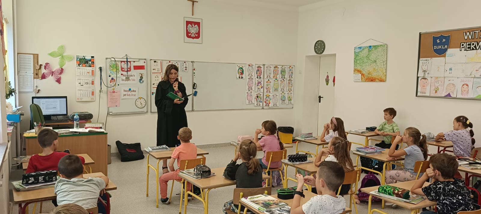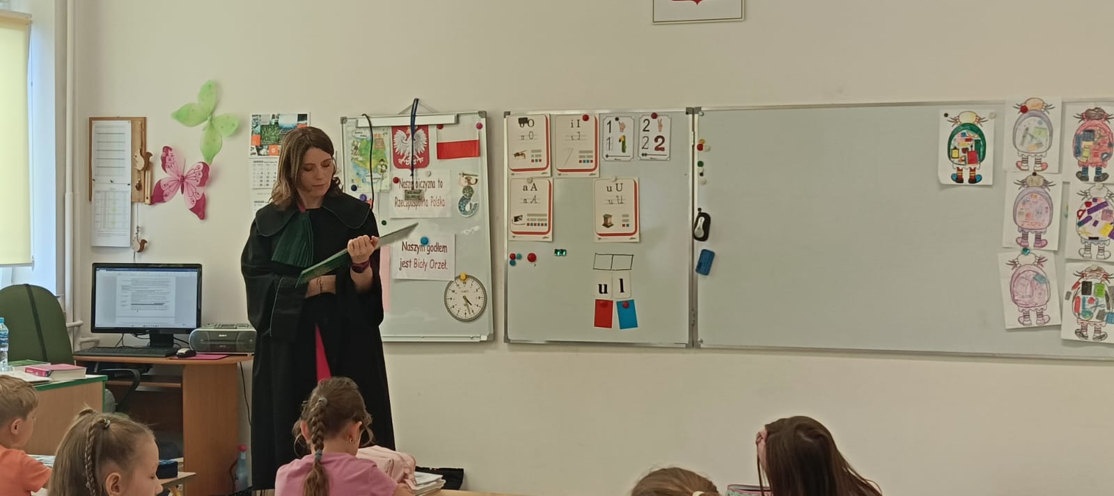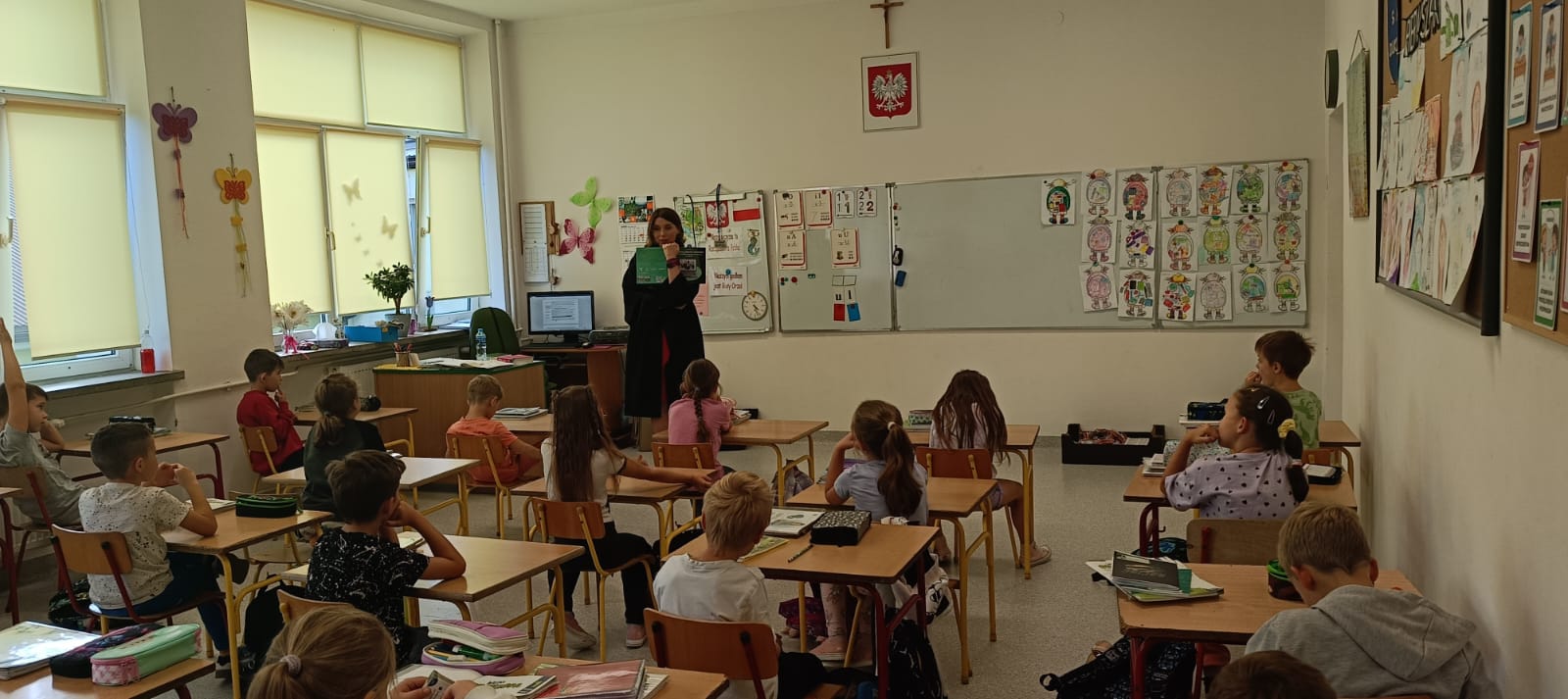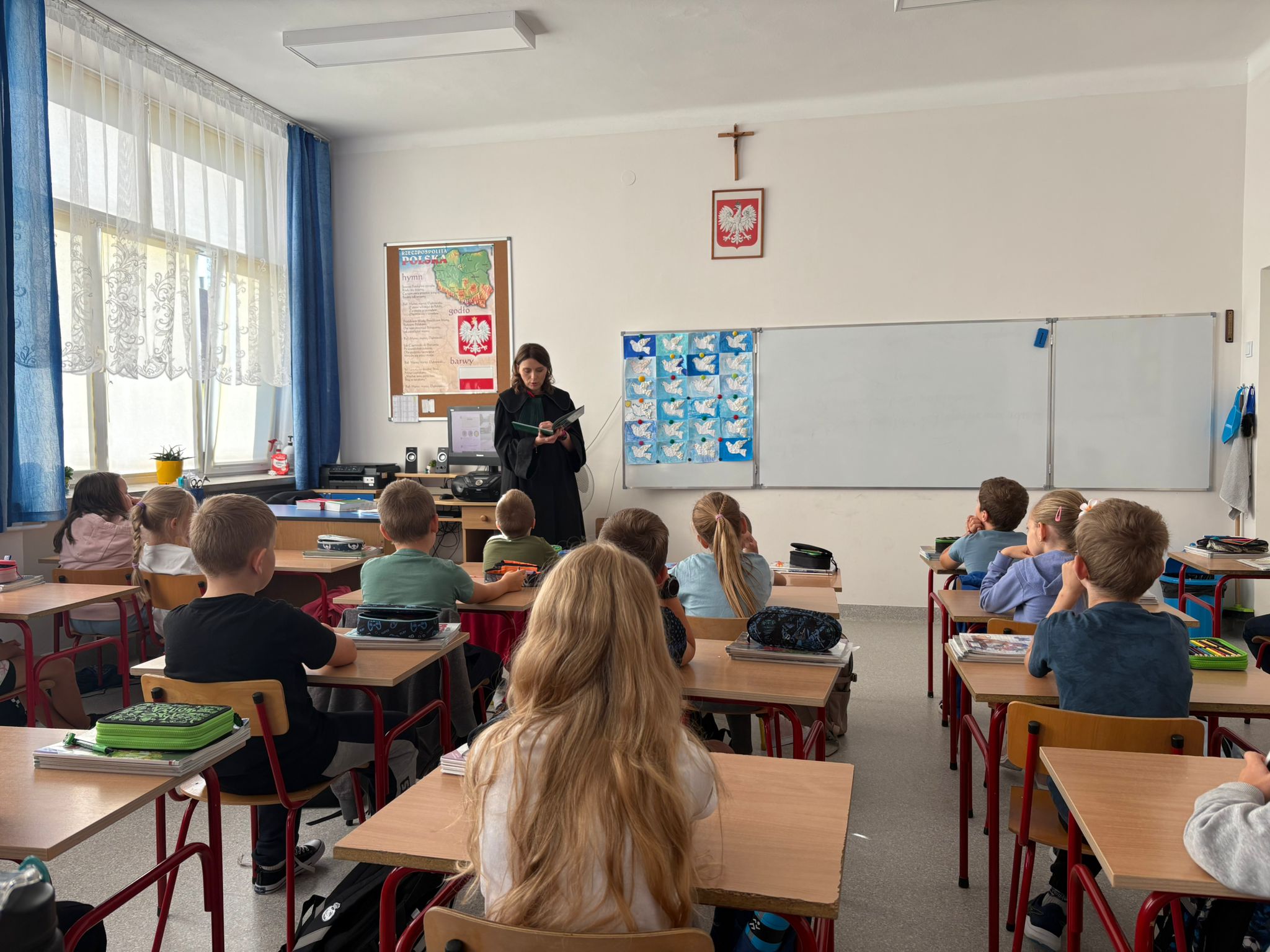 W dniach 18 i 19 września kolejny raz w naszej szkole przeprowadzona została dla chętnych klas ogólnopolska akcja „Bajeczni adwokaci”. Przeprowadziła ją pani mecenas Renata Dragan-Zięba, która poprzez czytanie bajki „Leśne sprawy aplikantów adwokackich , czyli hejt w internecie, tajemnicza nagroda i krecia robota pod wielką lipą” i pogadankę tematyczną wprowadziła uczniów w bardzo ważne tematy. Uczniowie dowiedzieli się, że niezależnie od tego, czy ktoś ma lat pięć czy pięćdziesiąt pięć, w Internecie może czyhać na niego wiele niebezpieczeństw i pułapek. Nauczyli się również, że słowo „hejt” ma bardzo negatywny oddźwięk i jest czymś bardzo złym. Szczególnie wartościowe było umiejętne połączenie przez panią mecenas języka dziecięcego z tematyką prawną i społeczną. Uczniowie nie tylko zdobyli cenną wiedzę o swoich prawach, ale również budowali w sobie postawę szacunku do innych, uważności na słowa i świadomego funkcjonowania w cyfrowym świecie. Dzieci otrzymały od pani adwokat pamiątkowe zakładki, malowanki i książki. Bardzo dziękujemy i wierzymy, że akcja ta w znacznym stopniu przyczyni się do podniesienia bezpieczeństwa cyfrowego i kształtowania właściwych relacji interpersonalnych.