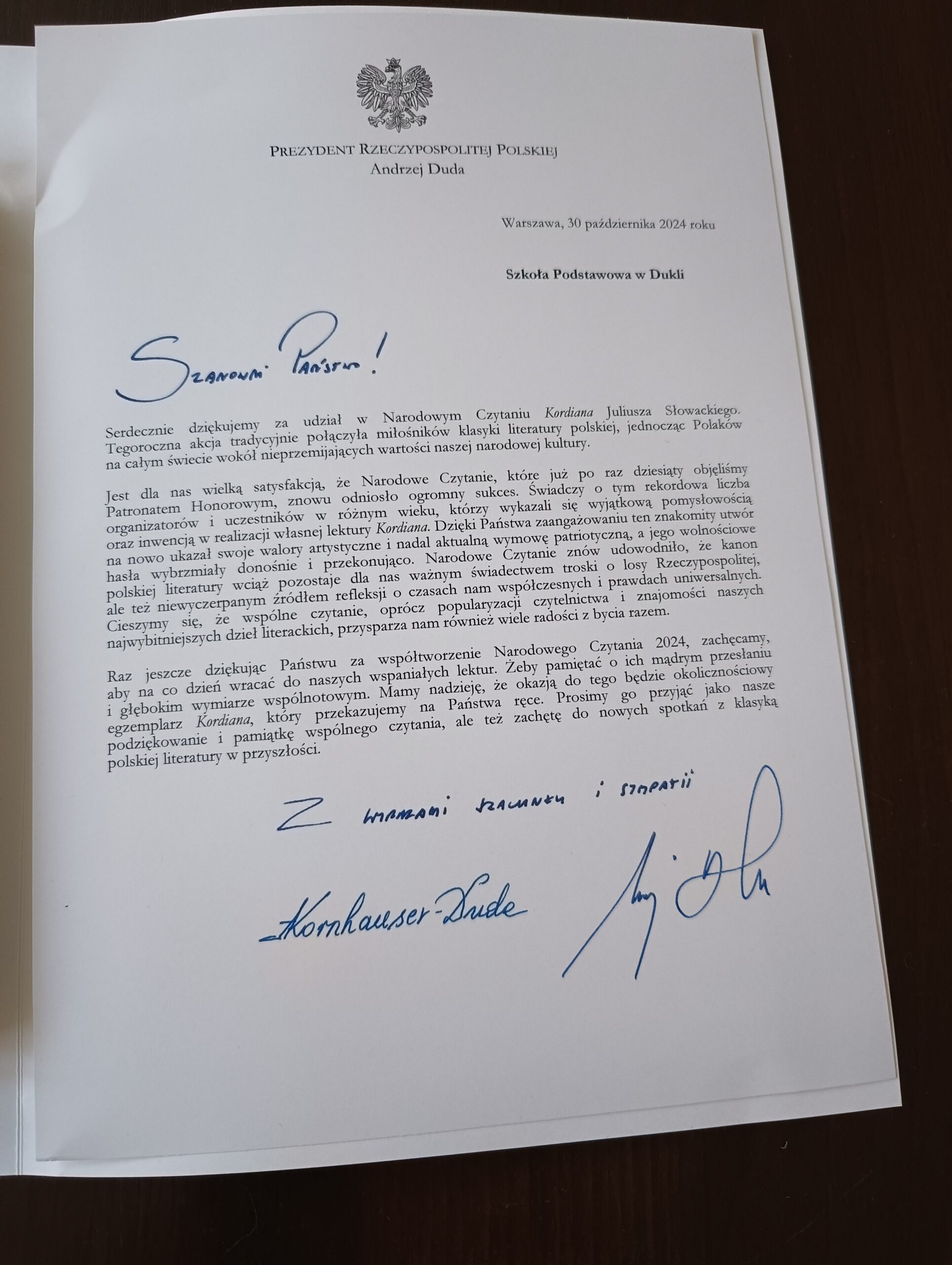 W ramach podsumowania akcji Kancelaria Prezydenta przysłała do Szkoły list Prezydenta Andrzeja Dudy z podziękowaniem za udział w dziesiątej edycji tej akcji. W liście czytamy m.in.: „Proszę przyjąć serdeczne podziękowania za Państwa udział w Narodowym Czytaniu Kordiana Juliusza Słowackiego (…) Cieszymy się, że wspólne czytanie oprócz popularyzacji czytelnictwa i znajomości naszych najwybitniejszych dzieł literackich, przysparza nam również wiele radości z bycia razem.”