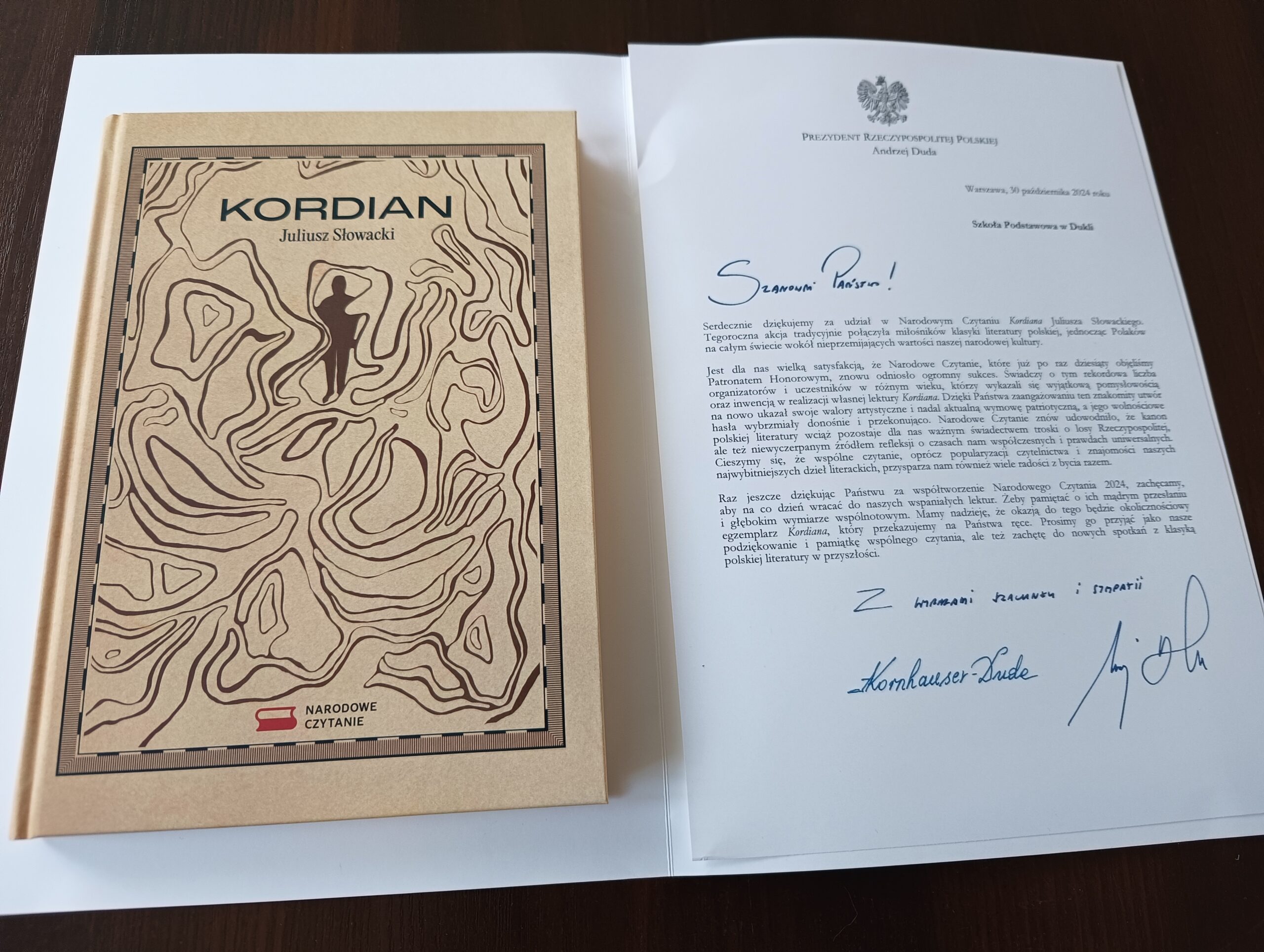 Do listu dołączono również okolicznościowe wydanie „Kordiana”, które wzbogaci zbiory szkolnej biblioteki. Jeszcze raz dziękujemy naszym uczniom za zaangażowanie w tę piękną akcję i serdecznie zapraszamy do Narodowego Czytania 2025, którego lekturą będzie twórczość Jana Kochanowskiego – Ojca polszczyzny, ojca naszej literatury. Będą to jego pieśni, fraszki, treny.