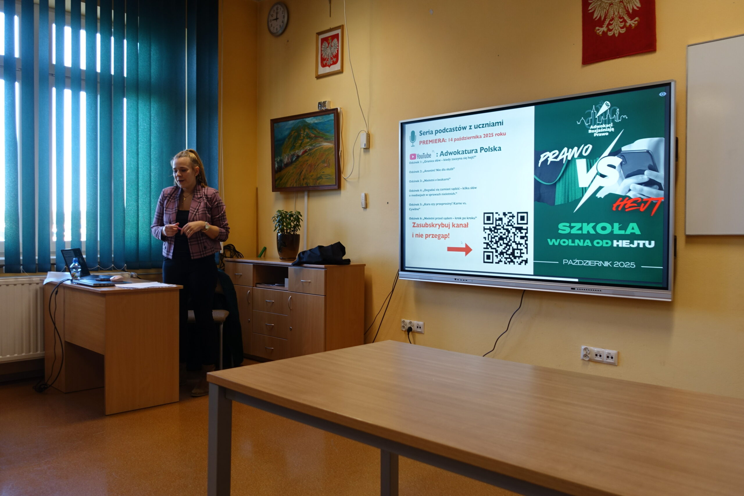 W ramach IV edycji ogólnopolskiej akcji edukacyjnej „Adwokaci rozjaśniają prawo” uczniowie z klasy 8c, 7a, 7c w dniu 30.10.2025, wzięli udział w spotkaniu edukacyjnym, które miało przewodni temat ” „Prawo vs. Hejt. Szkoła wolna od hejtu”
